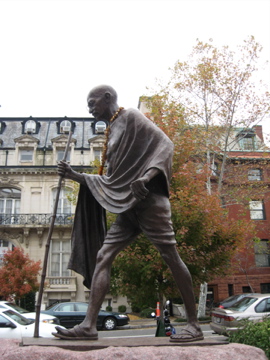 Statue of Mahatma Gandhi walking installed adjacent to Embassy Row -  Massachusetts Ave. NW near Dupont Circle, Washington DC. Image © L Peat O'Neil 2009